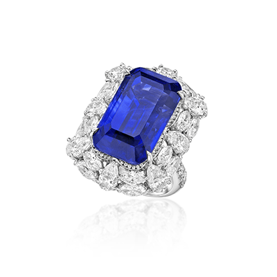 Ring featuring a 30.57-carat Sri Lankan sapphire centre gem with a royal blue velvet hue and surrounded by diamonds from P. V. GEMS